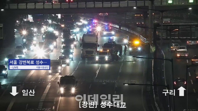 화물차 앞바퀴 빠져 사고 발생한 것으로 추정[이데일리 김현재 기자] 17일 오전 5시 47분쯤 서울 성동구 강변북로 일산 방향에서 차량 6대가 부딪히는 사고가 발생했다.
