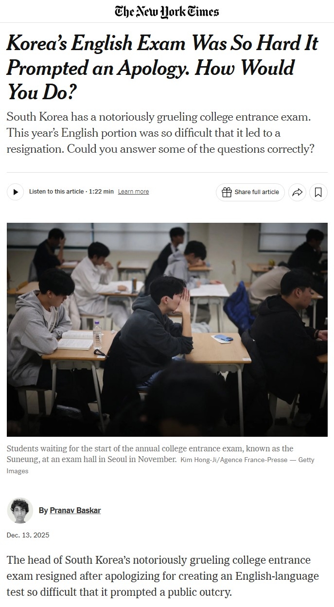 [헤럴드경제=김영철 기자] 올해 치러진 2026학년도 대학수학능력시험(수능)이‘불수능’이라는 평가가 나올 정도로 난도가 높아 외신들에서 연이어 보도되는 가운데 미국 뉴욕타임스(NYT)에서도 올해 수능 영어 문항들을 소개하면서 독자들에게 직접 풀어보라며 온라인 퀴즈를 만들었다.