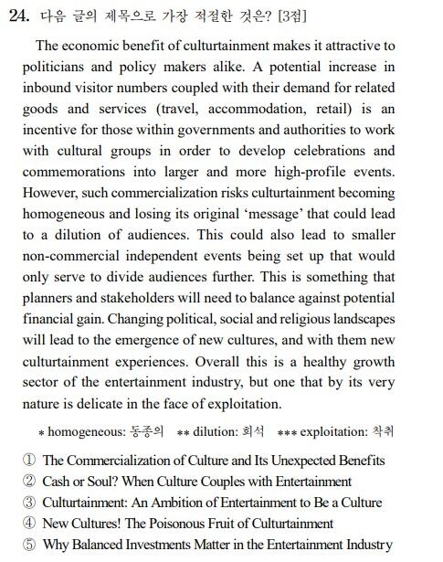 “맞힐 수 있겠느냐”며 NYT가 소개한 4개 문항은‘culturetainment’라는 합성어가 등장하는 24번,독일 철학자 임마누엘 칸트의 법철학을 다룬 34번,업 비트 시세시계가 반복적 자연현상을 이용한다는 점을 지적하는 36번,게임과 아바타와 가상공간에 관한 39번이었다.