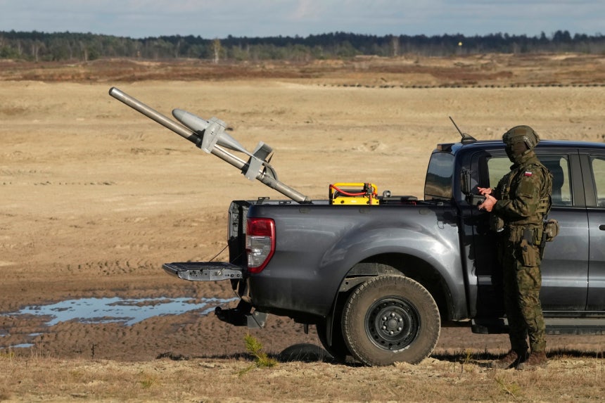 폴란드와 루마니아에 배치된 미국의 메롭스 드론 시스템.중형 픽업 트럭 뒷좌석에 실을 수 있을 만큼 작다.[AP]