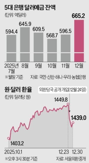 특히 작년 12월 24일 이후 집중적으로 늘어났다.지난달 24일은 당시 기획재정부가 “(환율 안정을 위해) 정부의 강력한 의지와 정책 실행 능력을 보여주겠다”며 원·달러 환율의 급격한 변동성을 완화하기 위해 시장 안정 조치에 나선 시점이다.5대 은행 중 한 은행에서는 지난달 월간 달러예금 증가분의 70%가 24~31일 늘어난 것으로 나타났다.