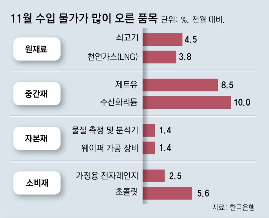 수입 원재료(2.4%)와 중간재(3.3%)의 물가 상승 폭이 자본재(1.5%)와 소비재(1.8%)보다 상대적으로 컸다.특히 원재료 중에선 농림수산품의 수입물가가 전월 대비 3.4% 올랐고,중간재에선 컴퓨터·전자 및 광학기기가 8.0%나 올랐다.소고기 수입물가는 전월 대비 4.5%나 상승했다.전년 동월 대비로는 15.4%나 올랐다.