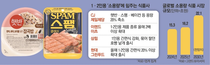 국가데이터처에 따르면 국내 1·2인 가구 비중은 2015년 전체 인구 중 55.2%에서 2020년 59.7%,2025년 66%(추정치)로 늘어나고 있다.시장조사기관 그랜드뷰리서치에 따르면 글로벌 1인분 식품 시장은 지난해 16조2000억원에서 2030년이면 22조1000억원대로 확대될 전망이다.