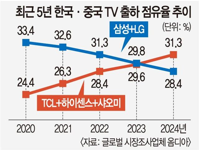 압도적인 경쟁력을 앞세워 세계 TV 시장을 석권해온 삼성전자와 LG전자가 가격 경쟁력에 품질까지 갖춘 중국 업체들의 매서운 추격에 고민이 깊어지고 있다.고가 제품 판매에 힘입어 매출액 기준 여전히 우위를 점하고 있지만‘초격차 기술’로 난공불락이던 프리미엄 시장에도 조금씩 균열이 일어나는 중이다.글로벌 통상 환경의 불확실성이 커지고,젊은 층을 중심으로 영상 콘텐츠를 TV로 소비하지 않는 기류까지 짙어지면서 “한국 TV 사업이 위기에 봉착했다”는 평가가 나온다.