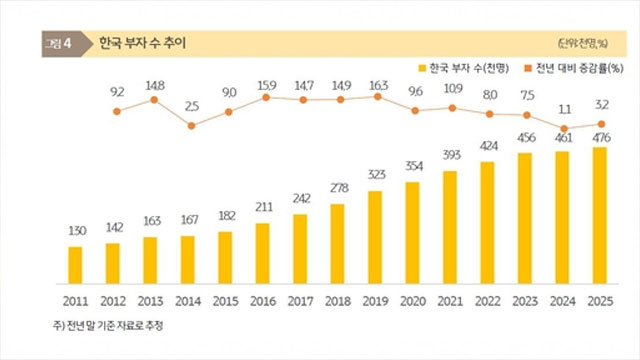 KB금융지주 경영연구소가 오늘(14일) 발간한‘2025 한국 부자 보고서’를 보면,지난해 말 기준 금융자산이 10억 원 이상인‘부자’는 모두 47만 6천 명,전체 인구의 0.92%로 추산됐습니다.