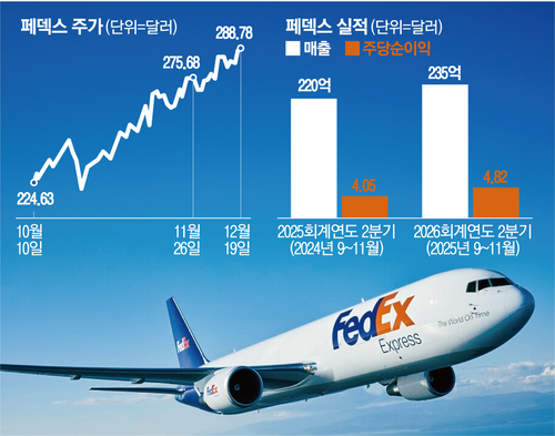 페덱스는 지난 18일 2026회계연도 2분기(2025년 9~11월)에 매출 235억달러,주당순이익(EPS) 4.82달러를 기록했다고 밝혔다.매출은 전년 동기 대비 7% 수준으로 증가했으며,시장 예상치인 227억8000만달러를 상회했다.수익성을 가늠할 수 있는 EPS가 같은 기간 19%나 증가했다.월가 예상치인 4.12달러도 크게 웃돌았다.