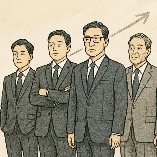 이재용(57) 삼성전자 회장은 23세에 입사해 54세 회장이 되기까지 31년 4개월이 걸렸으며,정의선(55) 현대차 회장은 24세 입사 후 27년 만인 50세에,신동빈(70) 롯데 회장은 33세에 입사해 23년 2개월 뒤인 56세에 회장이 됐다.