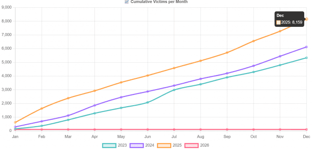 7일 랜섬웨어 추적 사이트 '랜섬웨어닷라이브' 등에 따르면 지난해 전 세계 랜섬웨어 피해 건수는 8천159건으로 집계됐다.이는 최근 3년 중 역대 최대치다.2023년 5천336건,2024년 6천129건 등에 비해 2천건 이상 랜섬웨어 공격이 급증했다.