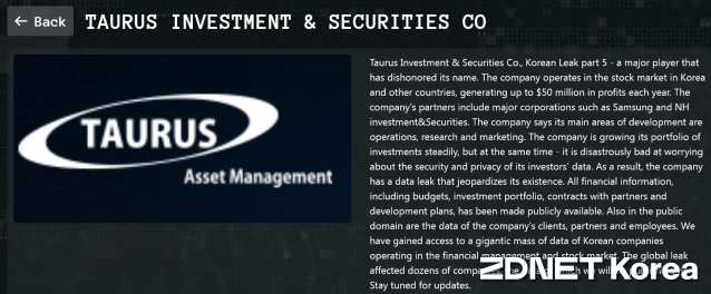 랜섬웨어 공격 그룹 '킬린'이 토러스 자산운용에 대한 내부 데이터 탈취를 주장하고 있다.(사진=킬린 다크웹 캡처)금융보안원의 도움으로 랜섬웨어 사태를 일단락 지은 SGI서울보증을 제외하면 이들 기업의 데이터는 여전히 다크웹상에 공개돼 있는 상태다.
