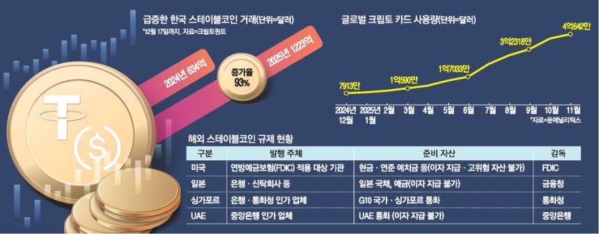 원화값 급락과 함께 국내 스테이블코인 거래량이 급증하고 있다.전 세계적으로 스테이블코인을 활용한 신용카드,국가 간 송금이 현실화하면서 거래량이 늘고 있지만 한국은 유달리 빠르게 진행되고 있다.