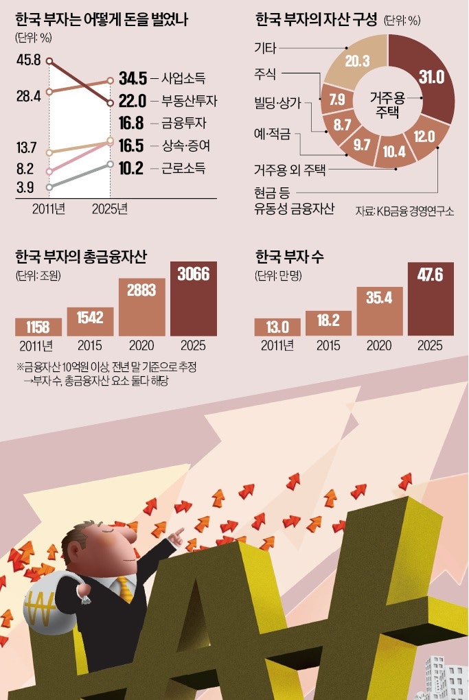 국내에서 금융자산을 10억원 이상 보유한 부자가 48만 명에 육박하는 것으로 나타났다.전체 인구의 약 1%에 해당했다.금융자산 300억원 이상 초고자산가는 1만2000명으로 5년 사이 두 배 늘어났다.KB금융그룹 경영연구소가 14일 발간한‘2025 한국 부자 보고서’에 따르면 지난해 말 기준 금융자산을 10억원 넘게 보유한 한국 부자는 47만6000명이었다.이는 전체 인구의 0.92%에 해당한다.전년 대비 3.2% 증가한 수치다.이 조사가 시작된 2011년(13만 명)과 비교하면 네 배 가까이 늘어났다.연평균 증가율은 9.7%였다.