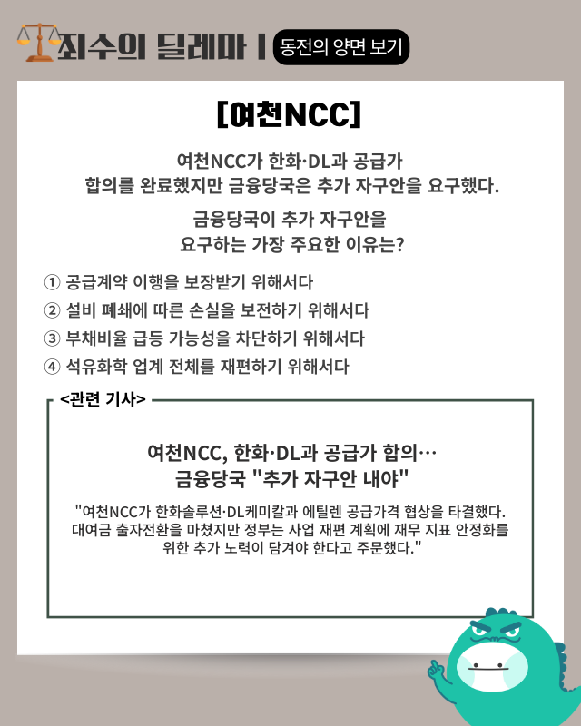 ▶기사 바로가기: 여천NCC,한화·DL과 공급가 합의…금융당국 “추가 자구안 내야”