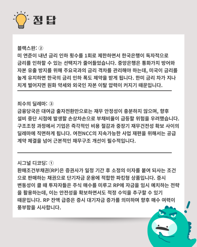 ■ 한은 금리 딜레마: 미국 연준이 기준금리를 3회 연속 인하했지만 한국은행은 환율 불안과 부동산 과열 우려로 금리 인하가 어려운 상황이다.원·달러 환율은 1473원에 마감하며 연준 금리 인하에도 불구하고 하락 폭이 제한적이었고,고환율 장기화 시 내년 물가가 0.2%포인트 추가 상승할 전망이다.