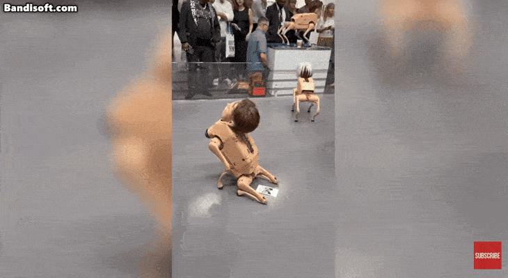 일론 머스크 테슬라 최고경영자(CEO),제프 베이조스 아마존 창업자의 얼굴을 한 로봇 개가 전시장 바닥을 네발로 종종거리다 갑자기 멈춰 서더니,