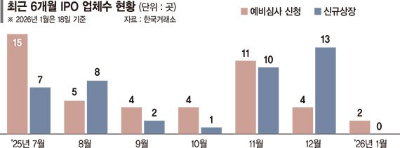 18일 한국거래소에 따르면 지난 1일부터 이날까지 신규상장을 위해 예비심사를 신청한 기업(코넥스,스팩,리츠 제외)은 2곳이다.아직 이달 중순에 접어들었지만,지난해 같은 달 5곳이 신청한 것과 비교하면 적은 수준이다.예비심사 신청 기업 수는 지난해 말부터 하락세다.지난해 11월 11곳이 신청한 뒤 지난달엔 4곳으로 줄었다.상장 기업 수도 크게 꺽였다.지난 2024년 1월과 지난해 1월은 각각 7곳과 4곳이 상장에 성공했으나 이달은 아직 한 곳도 없다.지난해 11월과 12월에는 각각 10곳,13곳이 상장했다.