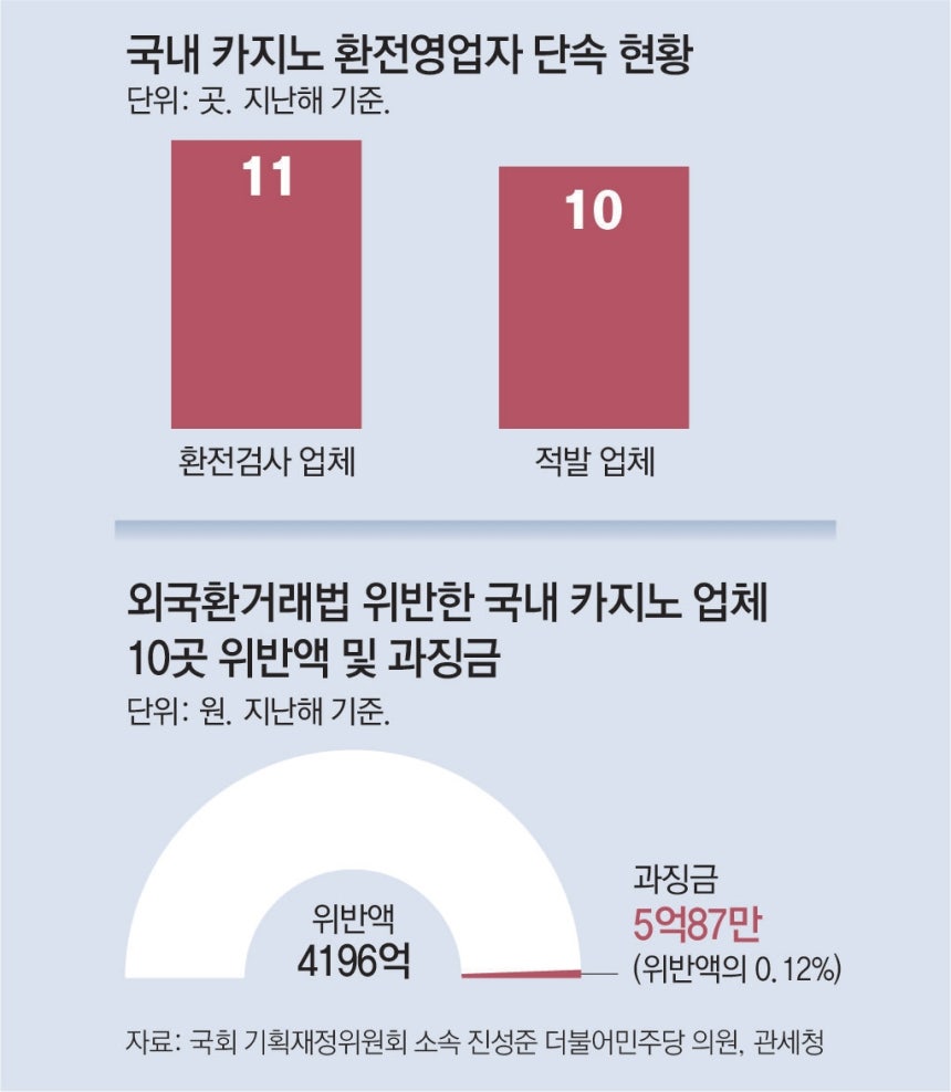 문제는‘솜방망이’처분이 카지노에 검은돈이 몰리는 걸 방치하고 있다는 점이다.국회 기획재정위원회 소속 진성준 더불어민주당 의원이 관세청으로부터 받은 자료에 따르면 2024년 국내 카지노 업체 11곳 중 10곳이 외국환거래법을 위반한 것으로 나타났다.적발된 업체의 불법 환전 금액은 총 4196억 원에 달했다.현행법에 따라 카지노 업체는‘카지노 환전영업자’로 등록한 뒤 환전할 수 있다.카지노를 방문한 외국인 관광객 등이 외화를 원화로 교환한 뒤 게임에 필요한 칩을 사는 구조다.그러나 적발된 업체들은 환전 과정에서 신고 의무를 소홀히 하거나 장부를 거짓으로 작성해 범죄 자산의 유입을 사실상 방치했다.