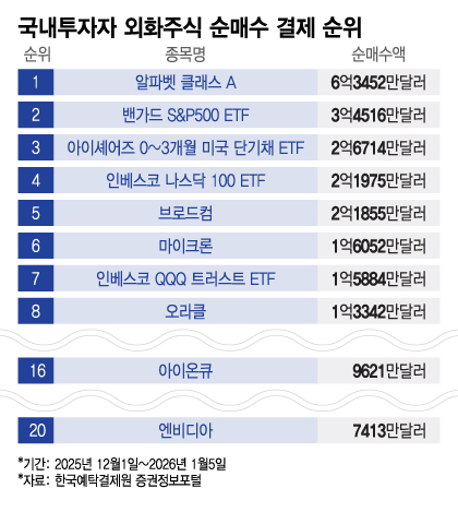 6일 한국예탁결제원 증권정보포털 세이브로에 따르면 지난해 12월1~5일 대형 연기금을 제외한 개인투자자와 소규모 자산운용사가 순매수한 해외주식 1~10위는 모두 미국주식이었다.가장 많이 순매수한 해외주식은 '알파벳 클래스A'로 총 6억3452만달러(약 9190억원) 규모였다.나스닥에 상장된 알파벳은 클래스A와 클래스C가 있는데 이 중 클래스A는 의결권을 갖고 있다.