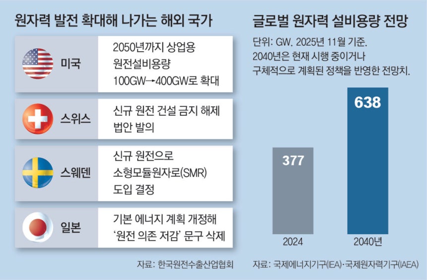 해외에서 원전 관련 신규 프로젝트가 잇따르는 것은 안정적으로 대규모 전력을 공급할 수 있는 원전이 AI발 전력난을 해소할 방법으로 떠오르고 있어서다.기후 위기에 대응하기 위한 청정에너지라는 점도 강조되고 있다.미국은 지난해 5월 현재 약 100GW 수준인 원전 발전용량을 2050년까지 400GW로 늘리겠다고 발표했다.유럽은 원전 용량을 2050년까지 109GW로 확대하는 계획을 추진하고 있다.일본,인도 등에서도 전력망 확보를 위한 원전 개발 및 가동 계획이 구체화되고 있다.