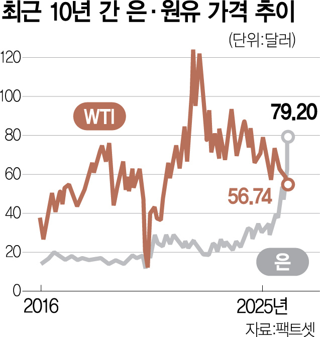 26일(현지 시간) 뉴욕상품거래소(COMEX)에서 은 선물은 7.69% 급등한 트로이온스당 77.196달러에 마감했습니다.9일 사상 최초로 60달러를 돌파한 지 불과 보름 사이에 80달러 선에 바짝 다가선 것입니다.같은 날 미국 서부텍사스산원유(WTI) 선물은 2.76% 급락한 배럴당 56.74달러에 거래를 마쳤습니다.이 같은 폭등세는 만성적인 은 공급 부족과 지정학적 갈등에 따른 국제 정세 불안,달러화 약세,미국 연방준비제도(Fed·연준)의 3연속 금리 인하 등 다양한 요인이 맞물린 결과로 분석된다.반면 WTI는 공급과잉과 세계 경기 둔화로 인해 올 들어 21% 하락해 2021년 2월 이후 최저 수준까지 떨어졌습니다.골드만삭스는 내년 미국 원유의 평균가를 배럴당 52달러로 내다봤는데,우크라이나 종전 시 러시아산 원유의 서방 수출 재개 가능성과 OPEC+의 증산 재개 가능성이 하방 압력으로 작용할 것이라는 관측이 나옵니다.