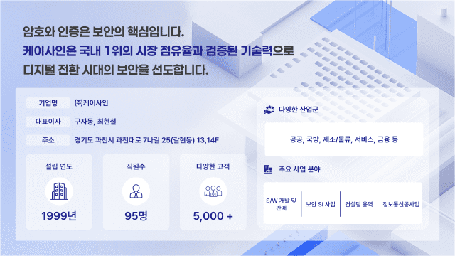 케이사인은 1999년 11월 설립된 정보보안 전문기업이다.약 100명의 구성원이 데이터 보호와 신뢰 기반 디지털 환경 구축이라는 비전 아래 개인정보 암호화·PKI 인증·통합 인증·모바일 보안·AI 보안 등의 사업을 전개하고 있다.공공·금융·민간 전반에서 축적한 기술력과 레퍼런스를 바탕으로 국내 대표 보안 기업으로 자리매김해왔다.