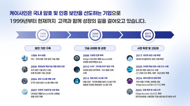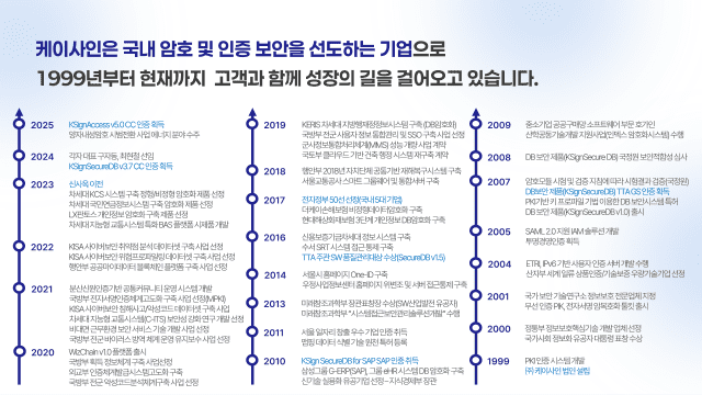 케이사인이 설립된 시기는 인터넷과 전자상거래가 본격적으로 확산하던 때다.안전한 전자서명과 인증 인프라의 필요성을 선제적으로 인식한 것이 케이사인의 출발점이었다.'신뢰할 수 있는 디지털 세상'을 구현하겠다는 문제의식에서 암호와 인증 기술을 핵심 역량으로 사업을 시작했다.2014년 11월 코스닥 시장에 스팩(SPAC)상장했다.매출은 2024년 처음으로 500억대를 돌파,517억을 기록했다.이 기간 영업이익은 매출의 20%가 넘는 130억을 달성했다.