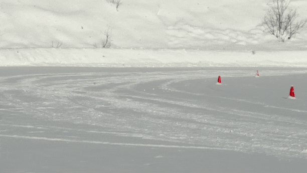 가장 먼저 진행한 테스트는 눈으로 만들어진 완만한 언덕길을 오르는 경사로 테스트였다.두 차를 타고 시속 20㎞로 오른 뒤 급정거했다.결과는 놀라웠다.두 타이어 모두 급제동과 함께 접지력을 잃으며 내리막 방향으로 미끄러졌다.