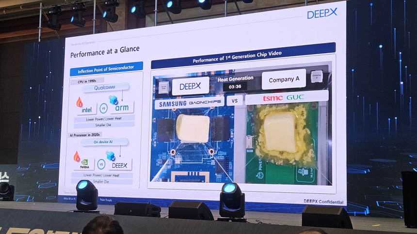 온디바이스 AI 반도체 기업 딥엑스의 김정욱 부사장은 이날 “7월부터 양산을 해 약 300개 업체와 기술검증(PoC)를 했고,약 20개 업체와 사업화를 진행 중”이라고 밝혔다.데이터센터의 전력 문제 때문에 NPU의 발열을 잡는 게 업계의 숙제다.버터는 약 36도 이상 온도에서 녹는데,딥엑스는 칩 위에 버터를 올려놓고 AI모델을 작동시켜 버터가 녹는지 테스트하는‘버터 벤치마크’를 통해 발열 기술을 선보이고 있다.