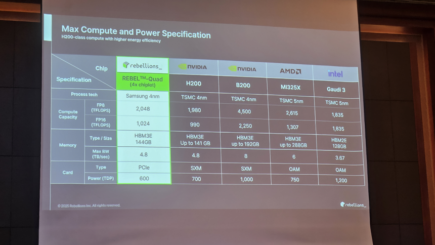 그러면서 “리벨리온의 리벨쿼드는 2PF(페타플롭스) 성능을 갖춰 국내 가속기 중에서는 가장 높은 수치를 기록했고 절대수치로만 비교하면 엔비디아의 가속기 H200급이라고 볼 수 있다”며 “엔비디아의 B200보다는 전력이나 가격적인 측면에서 매력이 있다”고 말했다.