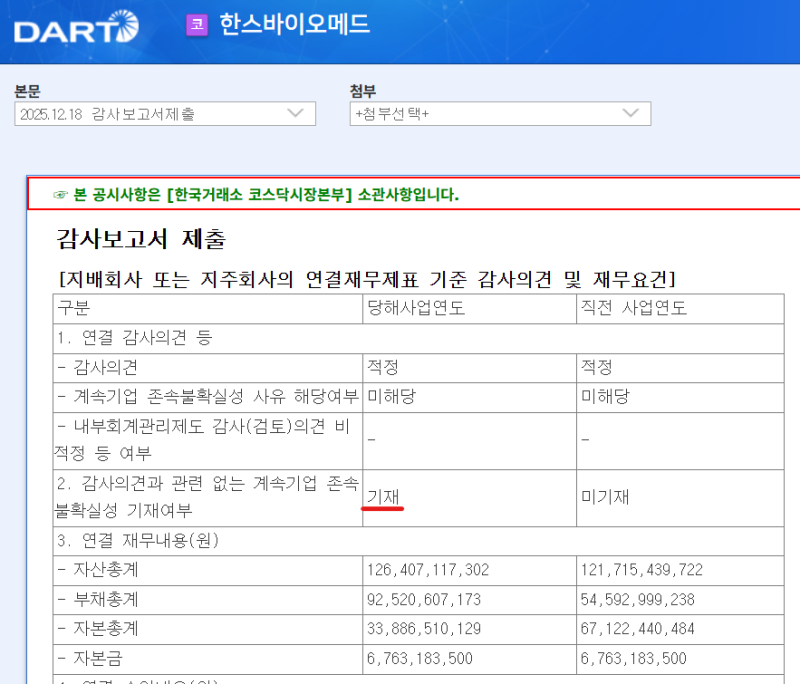 한스바이오메드는 회계 결산은 2024년 10월 1일부터 2025년 9월 30일까지로 설정됐다.외부감사인은 지난 9월 말 기준 순손실 321억원이 발생했고,