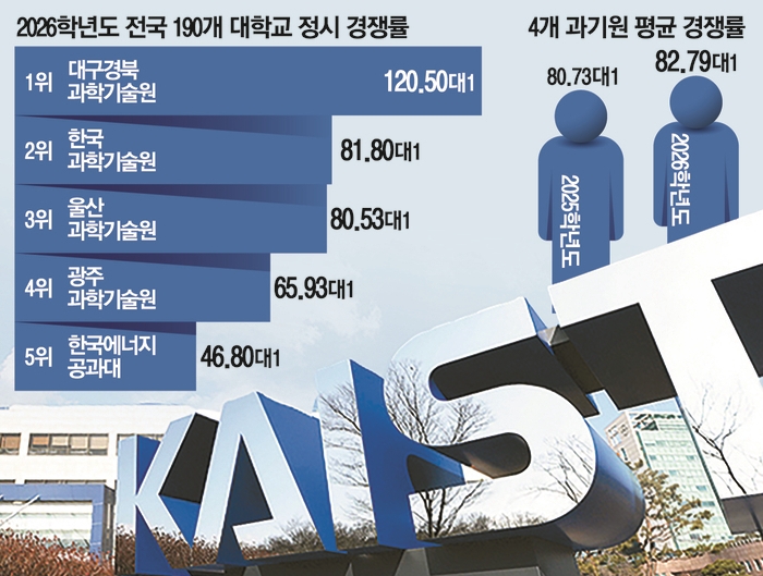 18일 종로학원이 전국 190개 대학의 정시 경쟁률을 분석한 결과,대구경북과학기술원이 120.50대1로 2026학년도 정시에서 가장 높은 경쟁률을 기록한 대학으로 나타났다.한국과학기술원이 81.80대1로 2위였고 울산과학기술원(80.53대1)과 광주과학기술원(65.93대1)이 그 뒤를 이었다.5위도 한국에너지공과대(46.80대1) 몫으로 돌아가며 공대들이 상위권을 휩쓸었다.