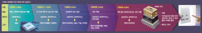 HBM은 D램을 여러 겹으로 쌓은 후‘실리콘 관통 전극(Through Silicon Via·TSV)’이라는 일종의 엘리베이터를 만들어 데이터나 전력이 이동할 수 있도록 만든 제품이다.많은 양의 데이터를 한번에 보낼 수 있는 대역폭(Bandwidth)이 HBM의 장점이다.