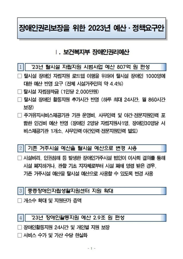 전장연의 지하철 시위는 '이동권 예산 확보' 목적이라고 알려져 있지만 실상은 조금 달랐다.전장연이 추경호 전 기획재정부 장관을 무작정 찾아가 건넨 장애인권리예산 정책요구안을 보면 전장연이 가장 먼저 화두로 올린 건 3조원에 가까운 탈시설 예산이었다.