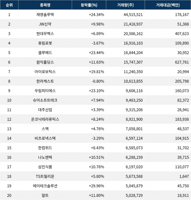 한편 거래량 상위 20위권 종목들은 대주산업(003310) ▲3.39%,온코닉테라퓨틱스(476060) ▲8.24%,스맥(099440) ▲4.76%,비츠로넥스텍(488900) ▼3.29%,한컴위드(054920) ▲8.43%,나노엔텍(039860) ▲10.51%,삼진식품(0013V0) ▲10.76%,TS트릴리온(317240) ▲5.80%,로또당첨번호조회 전체보기에이테크솔루션(071670) ▲29.96%,알트(459550) ▲11.80% 등의 성적을 기록하고 있다.