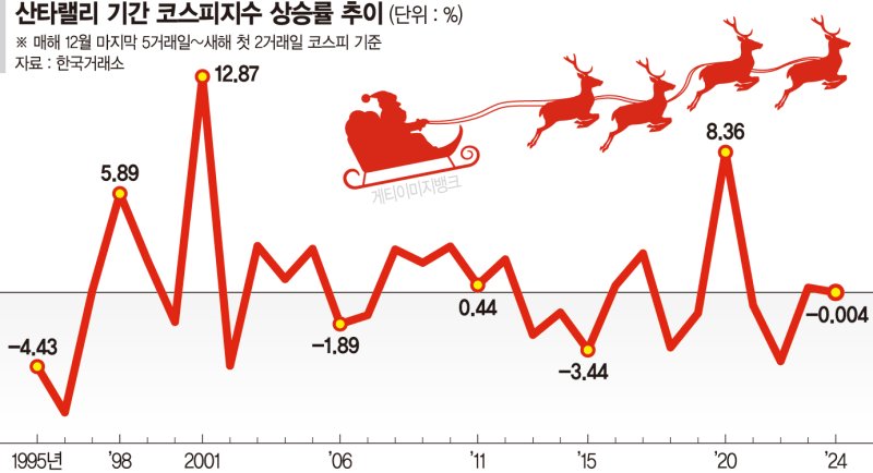24일 한국거래소 정보데이터시스템을 활용해 최근 30년간(1995~2024년) 코스피 흐름을 분석한 결과,산타랠리가 찾아온 해는 16번이다.