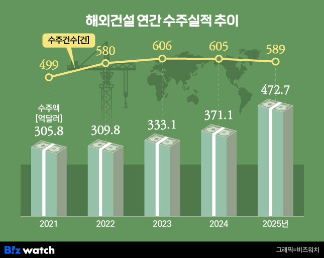 9일 국토교통부에 따르면 지난해 국내 기업의 해외건설 수주액은 2024년(371억달러) 대비 27% 증가한 수치다.해외건설 수주실적은 2022년 310억달러를 시작으로 △2023년 333억달러 △2024년 371억달러 △2025년 473억달러로 4년 연속 우상향 곡선을 그렸다.