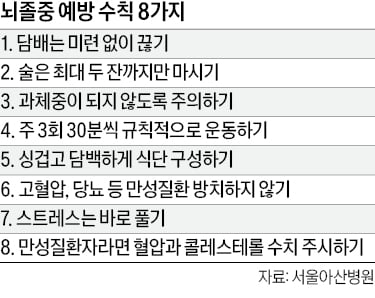 가장 큰 원인으로는 동맥경화로 인한 뇌경색이 꼽힌다.고지혈증이나 당뇨병,고혈압이 있으면 동맥경화가 가속화하기 쉽다.동맥경화로 혈관이 좁아지면 혈액 속 혈소판에 찌꺼기가 붙고 핏덩어리인 혈전이 생기기 때문이다.혈전이 그 자리에 가만히 있으면 별다른 문제가 없지만,떨어져서 뇌혈관을 막는 순간 뇌졸중이 발생한다.혈관이 막혀 산소 공급이 안 되며 뇌 손상이 진행되기 때문이다.