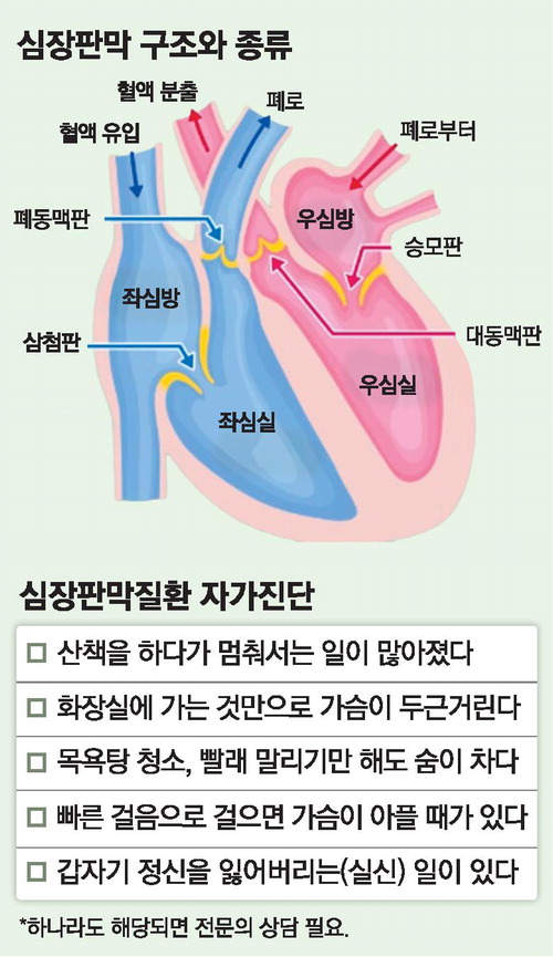 심장판막에 이상이 생긴 심장판막증은 병이 진행되면 숨이 차거나 부종이 나타나지만,고령자는 활동이 많지 않아 중증이라도 자각하지 못하는 경우가 많다.심장은 우심방과 우심실,좌심방과 좌심실 등 4개 공간으로 나뉘어져 있으며,그사이에는 밸브(Valve·판막)가 있다.혈액을 내보낼 때는 판막이 열리고,혈액을 내보낸 후에는 빠르게 닫아서 혈액이 역류하지 않도록 돼 있다.