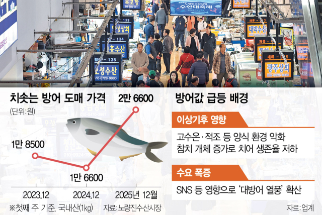 이상기후 여파로 겨울철 대표 어종인 방어 수급이 흔들리며 시장 전반에 파장이 일고 있다.출하가 지연되면서 제철임에도 방어 값이 급등하자 수산·유통 업계는 물론 소비자까지 부담을 호소하는 상황이다.방어를 포함한 겨울철 먹거리의 가격이 잇따라 오르면서 물가 불안 심리도 확산할 조짐을 보이고 있다.