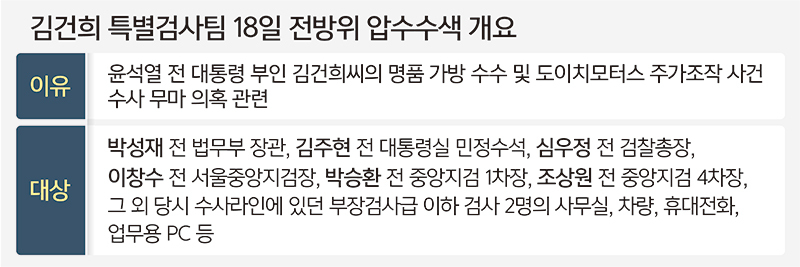 윤석열 전 대통령의 부인 김건희씨 관련 사건들의 수사를 검찰이 무마했다는 의혹을 수사 중인 김건희 특별검사팀(특검 민중기)이 18일 전직 검찰 지휘·수사라인에 대한 전방위 강제수사에 착수했다.특검팀은 수사기간이 28일 만료되는 만큼 최대한 신속히 압수물 검토와 관련자 소환조사를 진행하겠다며‘속도전’을 예고했다.