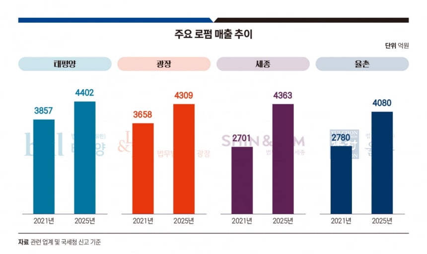 실제로 최근(2020~2024년)까지의 매출을 놓고 보면 세종(64%)과 율촌(51%)은 광장(28%)과 태평양(18%)을 크게 웃도는 성장세를 이어왔다.
