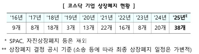올해 코스닥 상장폐지 결정 건수(38개)는 최근 3년 평균(15개)의 약 2.5배 수준으로 늘었다.내년 1월부터 시가총액 상장폐지 요건이 40억원에서 150억원으로 상향조정되면,14개 코스닥 상장사가 시가총액·매출액 기준으로 상장폐지 대상에 해당할 전망이다.최종적으로 기준 상향조정이 마무리되는 2029년에는 165개사(전체 코스닥 상장기업의 9.5%)가 이에 해당한다.