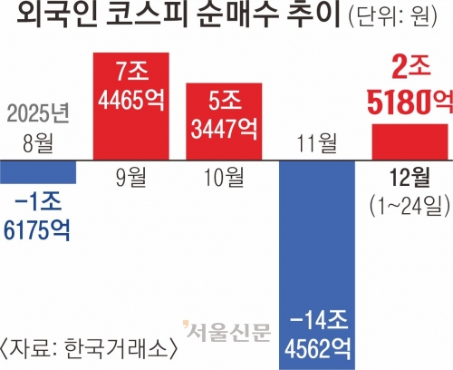 24일 한국거래소에 따르면 외국인은 이달(1~24일) 코스피 시장에서 2조 5180억원 순매수했다.지난달 14조 4562억원을 대거 팔아치운 뒤 한 달 만에 방향을 튼 것이다.