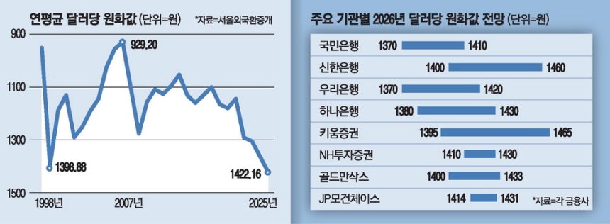 다만 내년에 원화값 약세 압력이 다시 불거질 수 있다는 경계감은 여전하다.해외 투자 확대라는 구조적 자금 유출 요인이 해소되지 않았기 때문이다.주요 은행과 증권사들도 내년 달러당 원화값이 1400원 선에서 형성될 것이란 전망을 내놓고 있다.1400원대 환율이 '뉴노멀'이 된 것이다.