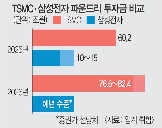 실적이 받쳐주지 않는 상황이다 보니 설비 투자 규모를 크게 늘리기도 부담이 되는 상황이다.삼성전자는 지난해 전체 반도체 설비 투자액 40조9000억원 가운데 10조~15조원을 파운드리에 투자한 것으로 전해졌다.올해 투자는 이보다는 더 늘 것으로 예상되지만,82조원을 투입하는 TSMC와 비교하면 20% 안팎에 불과한 수준이다.