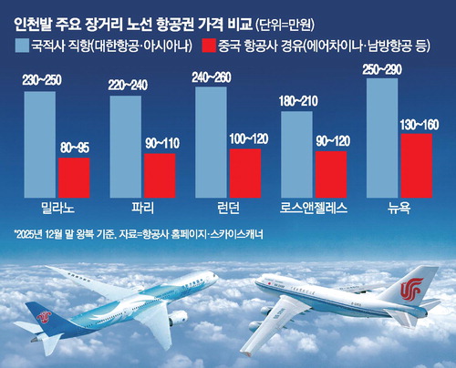 이들 항공사의 가격 경쟁력은 압도적이다.인천~유럽·미주 왕복 항공권이 국적사 직항 기준으론 200만원대 이상인 반면 중국 경유편으로는 80만~100만원대 초반의 '반값표'가 쏟아진다.