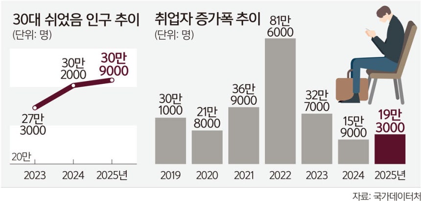 빈현준 데이터처 사회통계국장은 “30대에선 과거 결혼이나 출산으로 육아·가사로 이동했을 인구가 현재는 저출생·비혼의 증가로 쉬었음으로 이동했다”며 “채용 문화에 있어서는 수시채용·경력직 채용이 과거보다 늘어나면서 실업으로 가야 할 이들이 쉬었음이 된 것으로 보인다”고 분석했다.