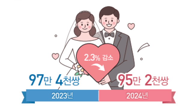 국가데이터처가 오늘(12일) 발표한‘2024년 신혼부부통계’를 보면,지난해 기준으로 혼인신고를 한 지 5년이 안 지난 부부는 95만 2천 쌍으로 1년 전보다 2만 2천 쌍,2.3% 줄었습니다.