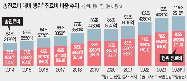국민건강보험공단이 최근 발표한‘2026년도 환산지수 연구’에 따르면 총진료비 대비 행위 진료비 비중은 2014년 64.8%에서 2024년 71.0%로 6.2% 포인트 늘어났다.행위 진료비란 의사가 환자에게 행하는 검사나 처치,로또369수술 등으로 인해 발생하는 비용을 말한다.행위 진료비가 늘어날수록 건강보험 급여 지출이 늘고,로또369그만큼 의사와 의료기관의 수입은 증가한다.
