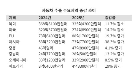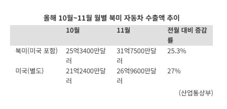 대미 관세 협상이 타결된 11월 대미 자동차 수출은 27% 개선된 것으로 나타났다.다만 이전까지 누적된 전년 대비 감소세 탓에 연간 북미·미국 누적 수출액 감소는 피하기 어려울 것으로 관측된다.