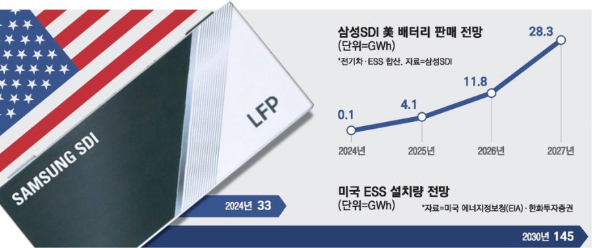삼성SDI가 미국에서 2조원대 수주 계약을 따내며 리튬인산철(LFP) 배터리 시장에 진출한다.삼성SDI는 미주법인인 삼성SDI아메리카(SDIA)가 미국 대형 에너지 인프라 운영업체와 에너지저장장치(ESS)용 LFP 배터리 공급 계약을 체결했다고 10일 밝혔다.2027~2030년까지 약 2조원어치 제품을 납품하는 게 골자다.올해 12조9000억원으로 추산되는 삼성SDI 연매출의 15% 규모다.